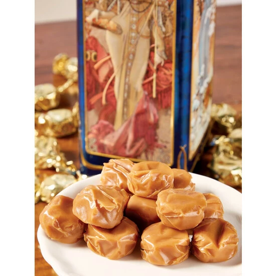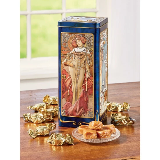 A homage to Czech artist Alphonse Mucha’s Art Nouveau style, this embossed tin is a true work of artโand it shimmers with richly colored prints of four romantic muses. The candy inside is just as sweetโtraditional English toffeeโsoft and chewy and made with plenty of real butter.