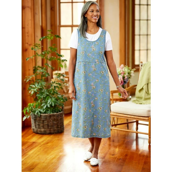 This pretty floral denim jumper features pink, yellow, green, and light blue blossoms that will instantly bring a smile to your face! The array of colors makes this denim jumper the most versatile in your closet as you can pair it will a variety of different colors tops and shirts. It has an easy, relaxed fit and features functional buttons at the sides for easy dressing and two roomy scoop pockets.