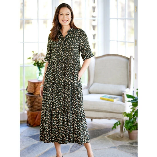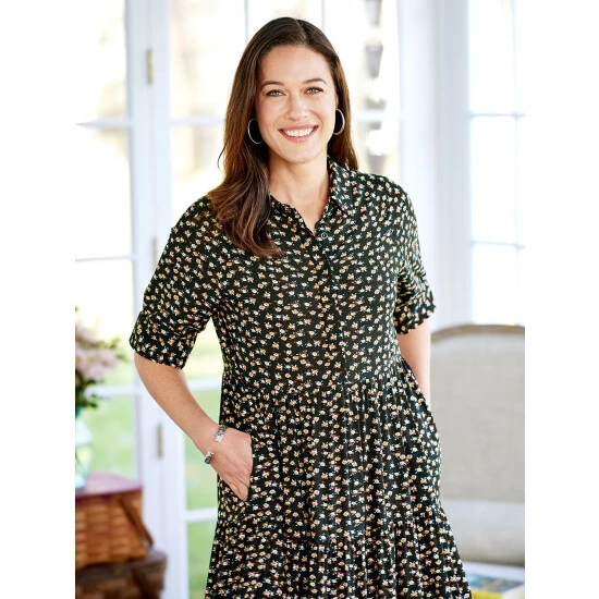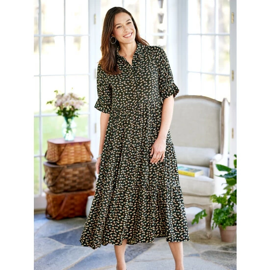 Mini peach-colored roses blossom with beauty on this soft black rayon dress while the 3-tiered skirt and gentle gathers along the waist provide shaping and style. Equally appealing is how the dress falls easily over your figure for a feel-good fit. Other details include self-covered buttons at the front placket, ΒΎ sleeves with banded cuffs, and side-seam pockets.