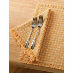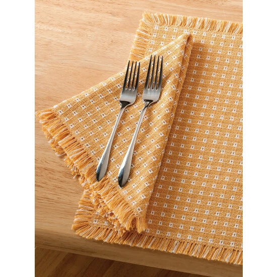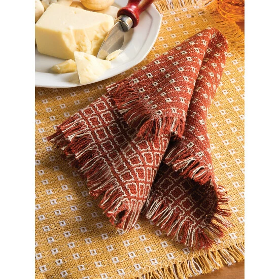 Give dining tables a festive look for Thanksgiving with our Mountain Weave Napkins in tried-and-true holiday colors. These sturdy, practical napkins recall the homespun fabric that was hand-loomed in the mountains of Vermont over 150 years ago. The cotton is grown in America and woven on 150-year-old traditional looms by master weavers in New England and then each piece is individually cut and hand fringed here in Vermont. When washed, the cotton softens and the weave tightens, which gives our Mountain Weave linens their homespun look and feel. For best results, follow the care instructions below.*