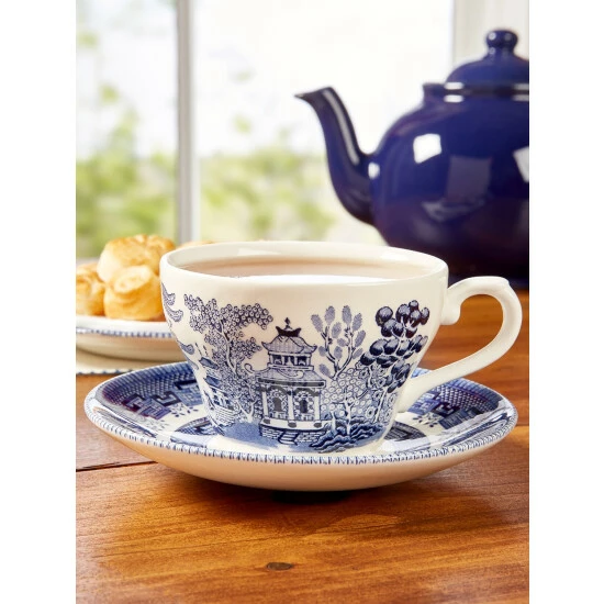 Originally created in 1780 in England, the Blue Willow pattern has become one of the most popular patterns in the world, gracing the tables of everyone from British aristocrats to everyday Americans. In fact, the term “Blue Plate Special” comes from the Blue Willow plates commonly used in restaurants and diners back in the 1920s thru the 1950s. Now you can add this teacup and saucer set to your Blue Willow collection.They’re crafted from sturdy ironstone and each piece is made using a copper plate, not a decal, which means no two pieces are exactly alikeโthe folks at Blue Willow call this “Charm of the Ware.”