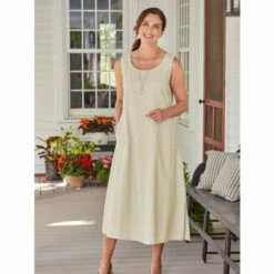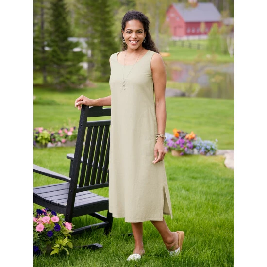 With its rich linen look and comfortable, cling-free drape, this A-line dress can be anything you need it to be. Going casual? Just slip it on and pair it with your favorite sandals. To dress it up, simply replace the sandals with heels and add a scarf or necklace and your favorite earrings. Other features include a flirty side slit on one side, a flattering scoop neck, and side-seam pockets.