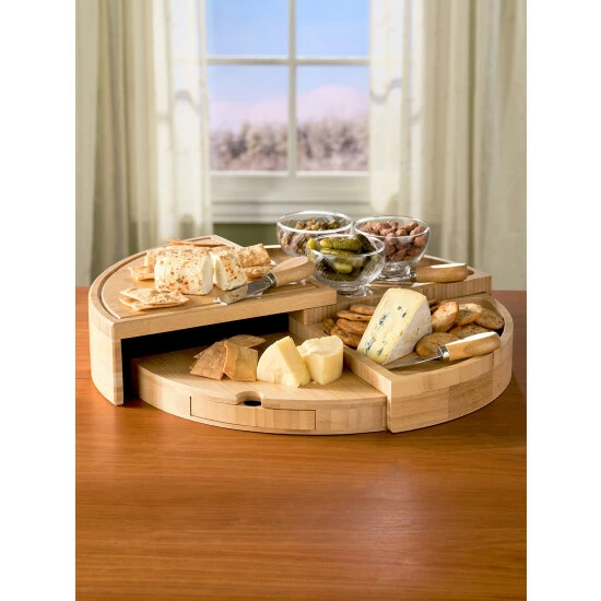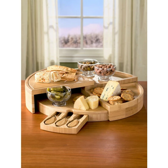 This compact wedge-shaped cheese board swivels open to create an impressive multi-level display for cheese, salami, olives, nuts, and moreโit’s the perfect design for making the most festive charcuterie board! The board has a built-in hidden drawer to hold the included three-piece cheese knife set.