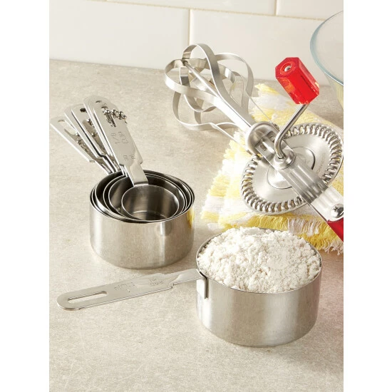 - Measuring cups nest for easy storage or hang on the wall