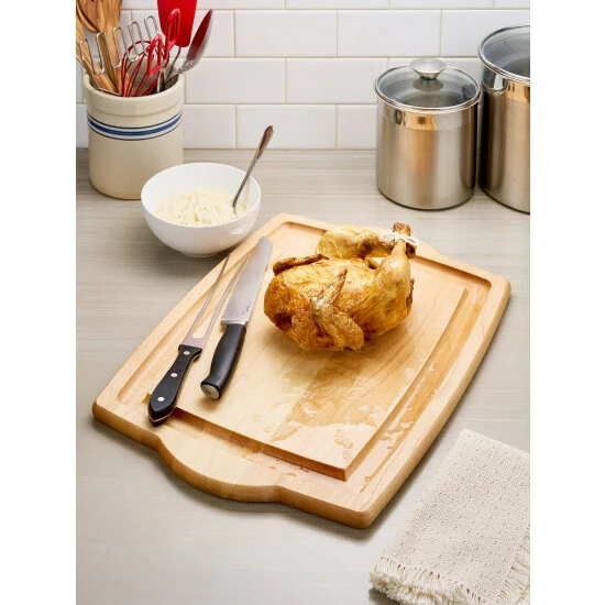 This cutting board is handcrafted with wood from sustainable sources and designed with a generous moat to collect juices when carving meats and other foods and to keep them in place when transporting food to the table. At 20″x14″xยพ”, this maple cutting board is the perfect size for a respectably sized turkey, whole chicken, beef roast, or loin and can be flipped over for a flat cutting or serving surface. While itโs sturdy enough for generations of use, itโs also lightweight, so it doesnโt require a gym membership to carry it from the kitchen to the dining room. Carved inset handles provide a secure grip. To keep your cutting board in tip-top shape, rub with mineral oil twice a year and never wash in the dishwasher or soak in water. Made in Vermont.